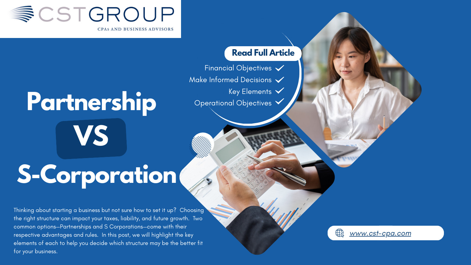 Thinking about starting a business but not sure how to set it up? Choosing the right structure can impact your taxes, liability, and future growth. Two common options—Partnerships and S Corporations—come with their respective advantages and rules. In this post, we will highlight the key elements of each to help you decide which structure may be the better fit for your business.